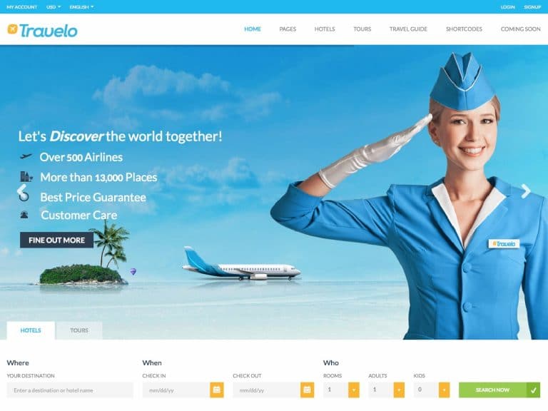 Travelo is a travel, tour and booking WordPress theme with an appealing flat design. This fresh WordPress theme comes with a professional payment system, powerful hotel booking system and a fully responsive design to display content well-organized on all modern mobile and desktop devices. You may utilize Travelo for all kinds of websites related to holidays and traveling where you need a fully-functional booking system. Benefit from several useful shortcodes as well as from the handy options panel.